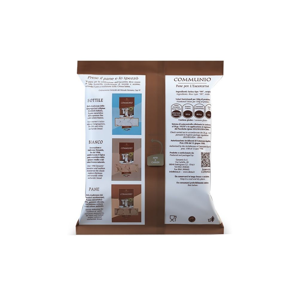 Dalla tradizione dei monasteri nordeuropei, il Pane Eucaristico COMMUNIO, caratterizzato dallo spessore elevato, dall’intensa cottura e dal colore ambrato, viene realizzato solo con selezionata farina di tipo “00” (NO OGM) e acqua, nel pieno rispetto delle normative vigenti in materia di lavorazione dei prodotti alimentari e delle normative igienico sanitarie, seguendo sempre rigorosamente i dettami del Codice di Diritto Canonico, al fine di dare ai consumatori garanzia di qualità, genuinità e tradizione clericale.