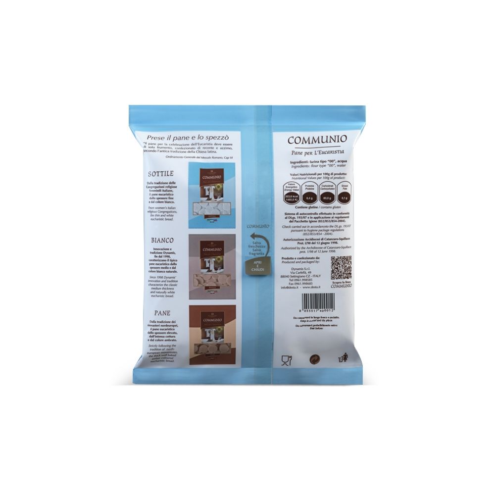 Dalla tradizione delle Congregazioni religiose femminili italiane, il Pane Eucaristico COMMUNIO dallo spessore fine e dal colore bianco viene realizzato solo con selezionata farina di tipo “00” (NO OGM) e acqua, nel pieno rispetto delle normative vigenti in materia di lavorazione dei prodotti alimentari e delle normative igienico sanitarie, seguendo sempre rigorosamente i dettami del Codice di Diritto Canonico, al fine di dare ai consumatori garanzia di qualità, genuinità e tradizione clericale.